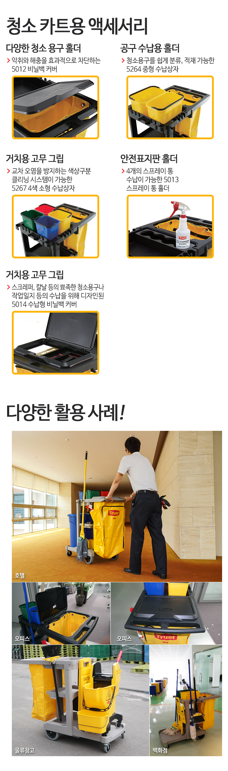전세계 건물관리 산업에서 가장 많이 사용되고 있는 디자인의 제품 청소 용품 운반과 동시에 쓰레기 처리를 함께 할 수 있어 작업의 효율을 높일 수 있는 제품 쉽게 청소할 수 있도록 부드럽게 표면 처리된 견고한 플라스틱 프레임 쓰레기를 쉽게 비울 수 있도록 디자인된 지퍼방식 비닐백 자국이 남지 않는 20cm 고정휠과 10cm 회전 바퀴가 장착되어있어 쉽게 이동이 가능 내장된 고무 그립으로 다양한 사이즈의 빗자루대와 마포대 등을 거치 가능 대형 건물, 공항, 리조트, 종합 병원 등 여러 장소에서 사용자의 필요에 따라 선택할 수 있는 다양한 액세서리 장착 가능 |