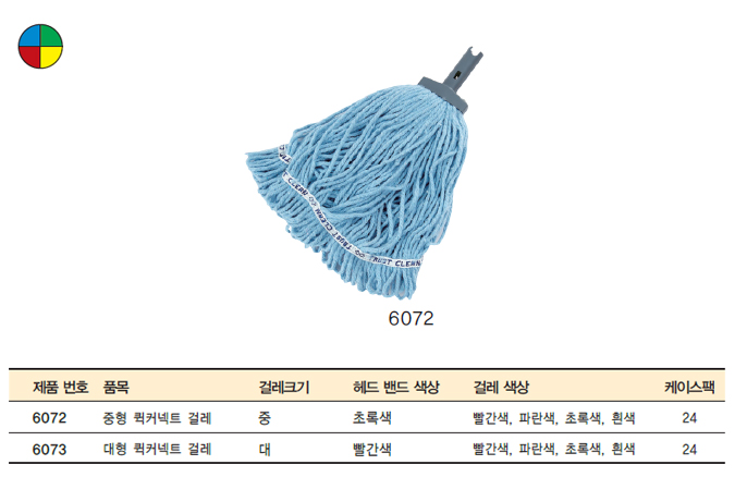 일반 청소 용도로 사용되는 마포 걸레 원터치 방식으로 쉽게 탈부착이 가능하도록 설계된 제품 걸레 끝이 둥글게 묶여 있고, 테일밴드 처리가 되어 있어 더 넓은 바닥면을 청소할 수 있음 면사와 합성사를 균형있게 혼합하여 흡수력과 강도를 높임 다양한 종류의 마포 탈수기(5211,5223,5226 등)와 함께 사용 가능 퀵커넥트 핸들(6413/6414)과 함께 사용가능 (별도 판매) |
