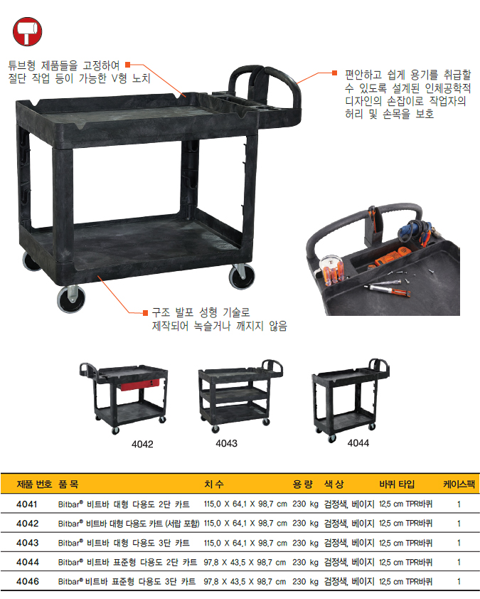 어떤 아이템도 쉽게 운송 가능한 혁신적인 디자인 구조 발포 성형 기술로 제작되어 녹슬거나 깨지지 않음 작은 제품이나 도구 등을 효과적으로 수납하기 위해 성형 가공된 적재 공간 및 컵홀더 편안하고 쉽게 용기를 취급할 수 있도록 설계된 인체공학적 디자인의 손잡이 카트 지지대의 성형 가공된 구멍들에 철제 파이프나 코일 및 얼레를 끼워 철사 및 전선 등을 감아 정리할 수 있도록 설계 |