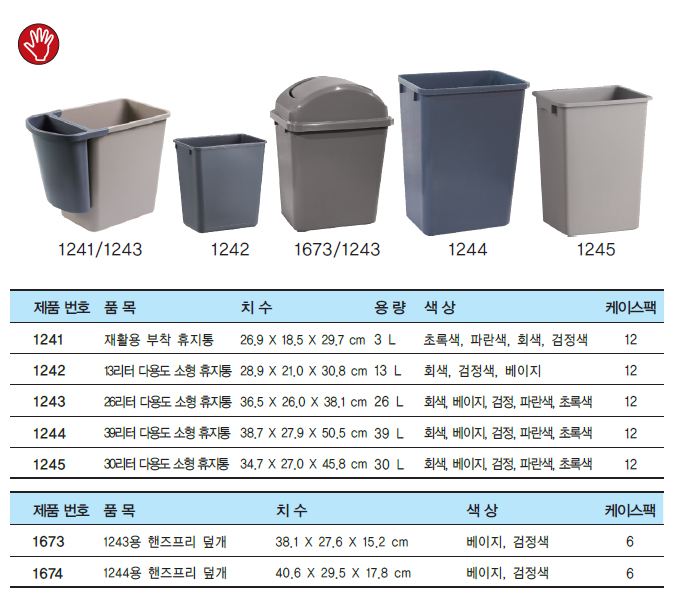 슬림한 디자인으로 좁은 공간에도 잘 맞는 공간활용형 휴지통 내구성을 높이고 청소가 쉽도록 둥글게 처리된 테두리 사용자의 안전을 위하여 입구가 둥글게 처리됨 효율적인 쓰레기 처리를 위해 책상 밑이나 옆에 두고 사용하기 편리하게 디자인됨 휴지통의 용량을 줄이지 않으면서 쉽게 쓰레기 처리가 가능한 둥근 스윙 덮개 쓰레기 처리 효율성을 높여주는 핸즈프리 덮개 |