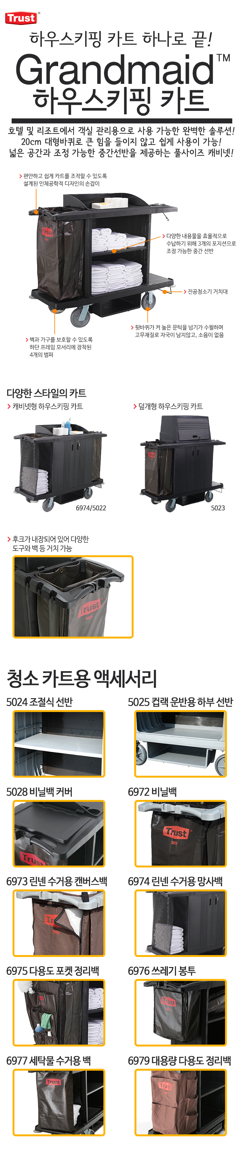 호텔 및 리조트에서 객실 관리용으로 사용 가능한 완벽한 솔루션 제공 쉽게 청소할 수 있도록 부드럽게 표면 처리된 견고한 플라스틱 프레임 20cm 대형바퀴로 큰 힘을 들이지 않고 쉽게 사용이 가능하여 작업자의 업무효율을 높일 수 있는 제품 편안하고 쉽게 카트를 조작할 수 있도록 설계된 인체공학적 디자인의 손잡이 벽과 가구를 보호할 수 있도록 하단 프레임 모서리에 장착된 4개의 범퍼 넓은 공간과 조정 가능한 중간선반을 제공하는 풀사이즈 캐비넷 |